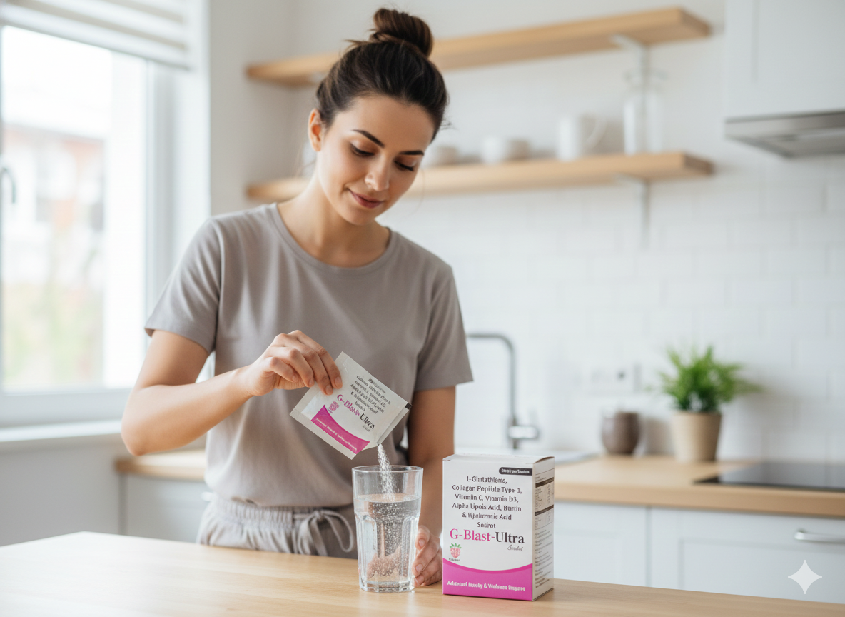 G-Blast Ultra Sachet combines 1000 mg Glutathione, Collagen Peptide, Vitamin C, Vitamin D3, Biotin & Hyaluronic Acid to brighten skin, reduce pigmentation, and improve anti-aging results. Take one sachet daily or as advised by a healthcare expert for visible radiance and even skin tone.