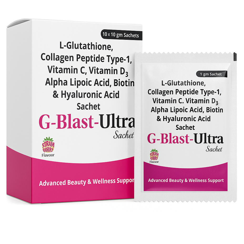 G-Blast Ultra Sachet is an advanced oral beauty supplement designed to support skin whitening, hyperpigmentation reduction, wrinkle repair, and dark circle improvement. Its high-strength combination of 1000 mg Glutathione, Collagen Peptide-1, Vitamin C, Vitamin D3, Alpha Lipoic Acid, Biotin, and Hyaluronic Acid works synergistically to promote brighter, younger-looking, moisturized skin.